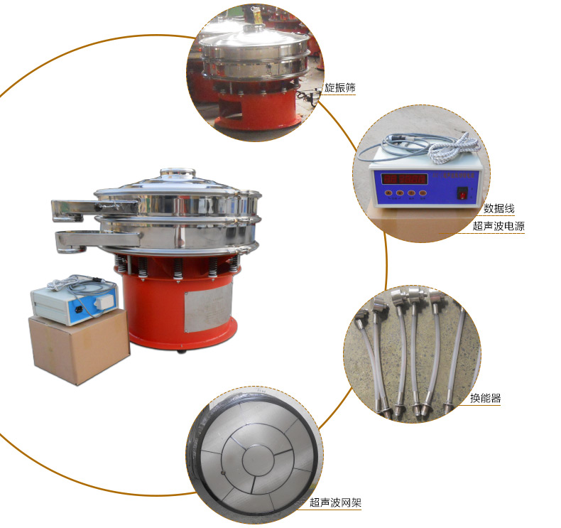 颜料粉超声波振动筛由超声波谐振电源、振荡器、共振环组成。 颜料粉超声波振动筛是在旋振筛的基础上加了一套超声波系统。在筛网上面叠加一个高频率低振幅的超声振动波,颜料粉筛选时接受巨大的超声加速度,使其在筛面上保持悬浮状态,从而抑制粘附、摩擦、平降、楔入等堵网因素,从而解决了强吸附性、易团聚、高静电、高精细、高密度、轻比重等影响筛分效率的因素。将220V、50Hz的电能转化为38KHz的高频电能,输入超声换能器,从而达到高效筛分和清网的目的。超声波谐振电源产生的高频电振荡由振荡器转换成高频正弦形式的纵向振荡波,这些振荡波传到共振环上使共振环产生共振,然后由共振环将振动均匀传输至筛面。筛网上的物料在做低频三次元振动的同时,叠加上超声波振动,既可防止网孔堵塞,又可提高筛分产量和质量。